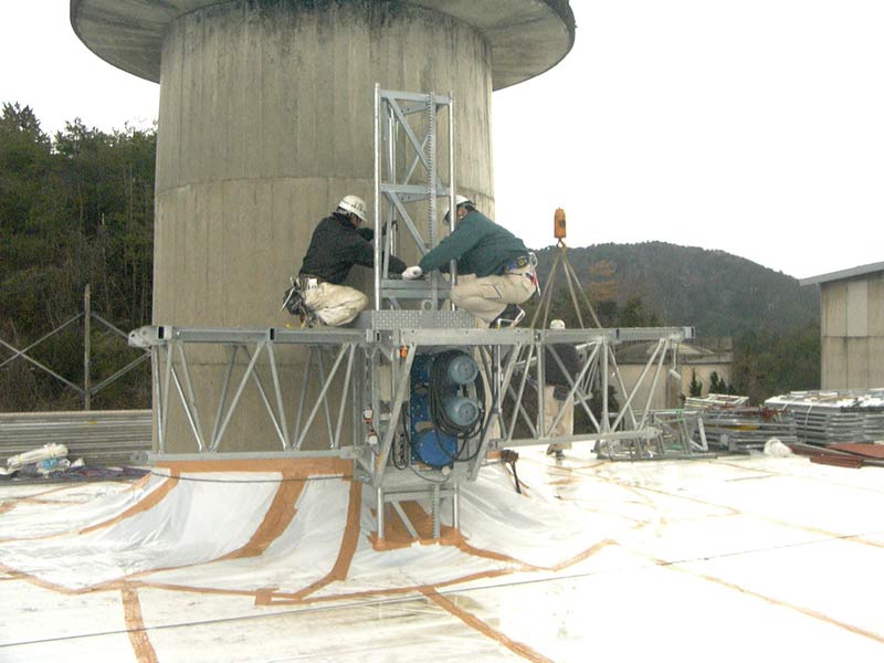 煙突解体工事、煙突改修工事で移動昇降式足場「リフトクライマー」使用時の施工写真と実績です。リフトクライマーをご利用いただくと、下記のようなメリットがございます。